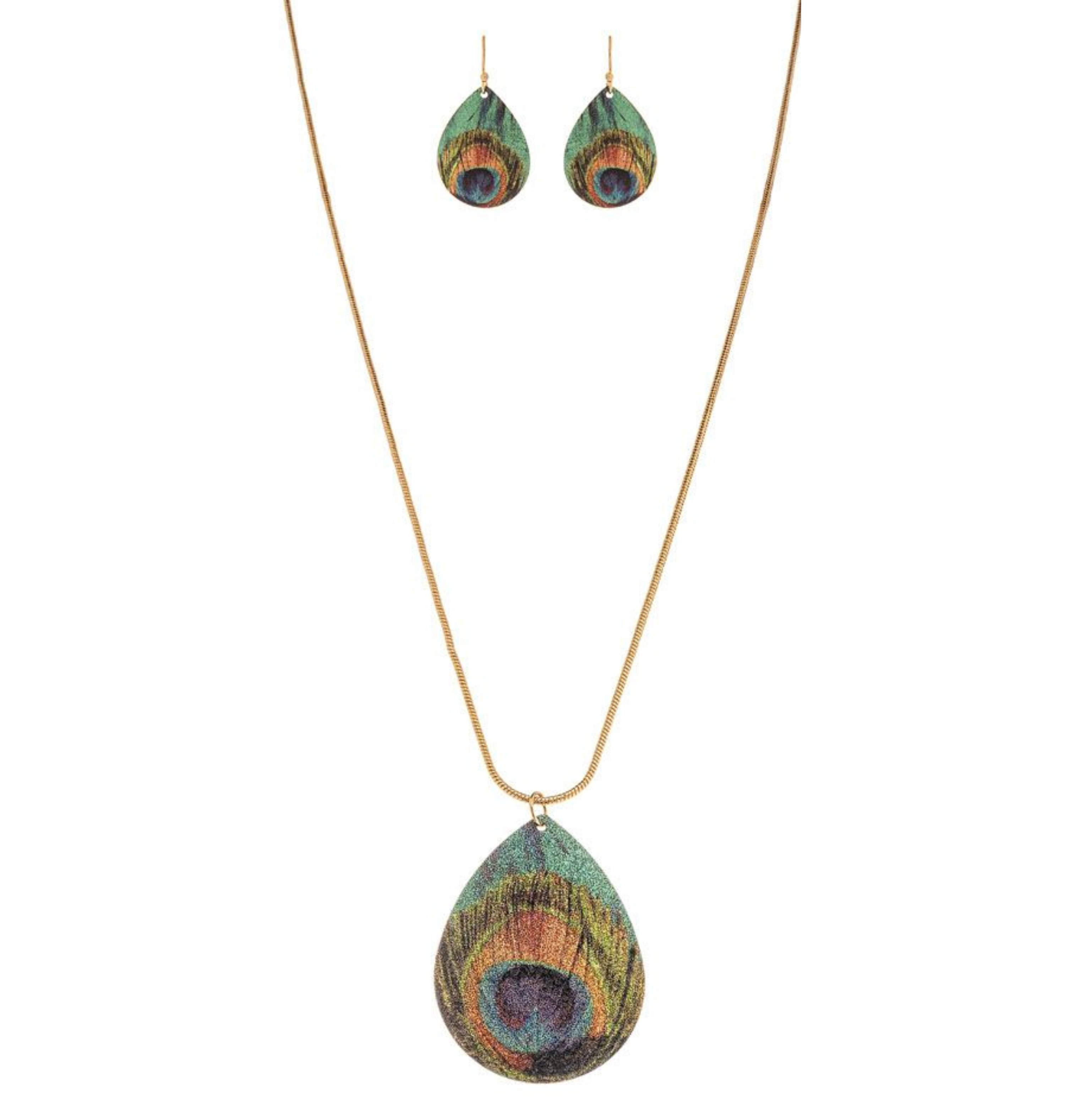 A-Train Gold Peacock Necklace Set: Elegant mixed-metal necklace and earrings with large teardrop pendants, showcasing vibrant green, blue, and bronze peacock feather patterns for a coordinated look.
