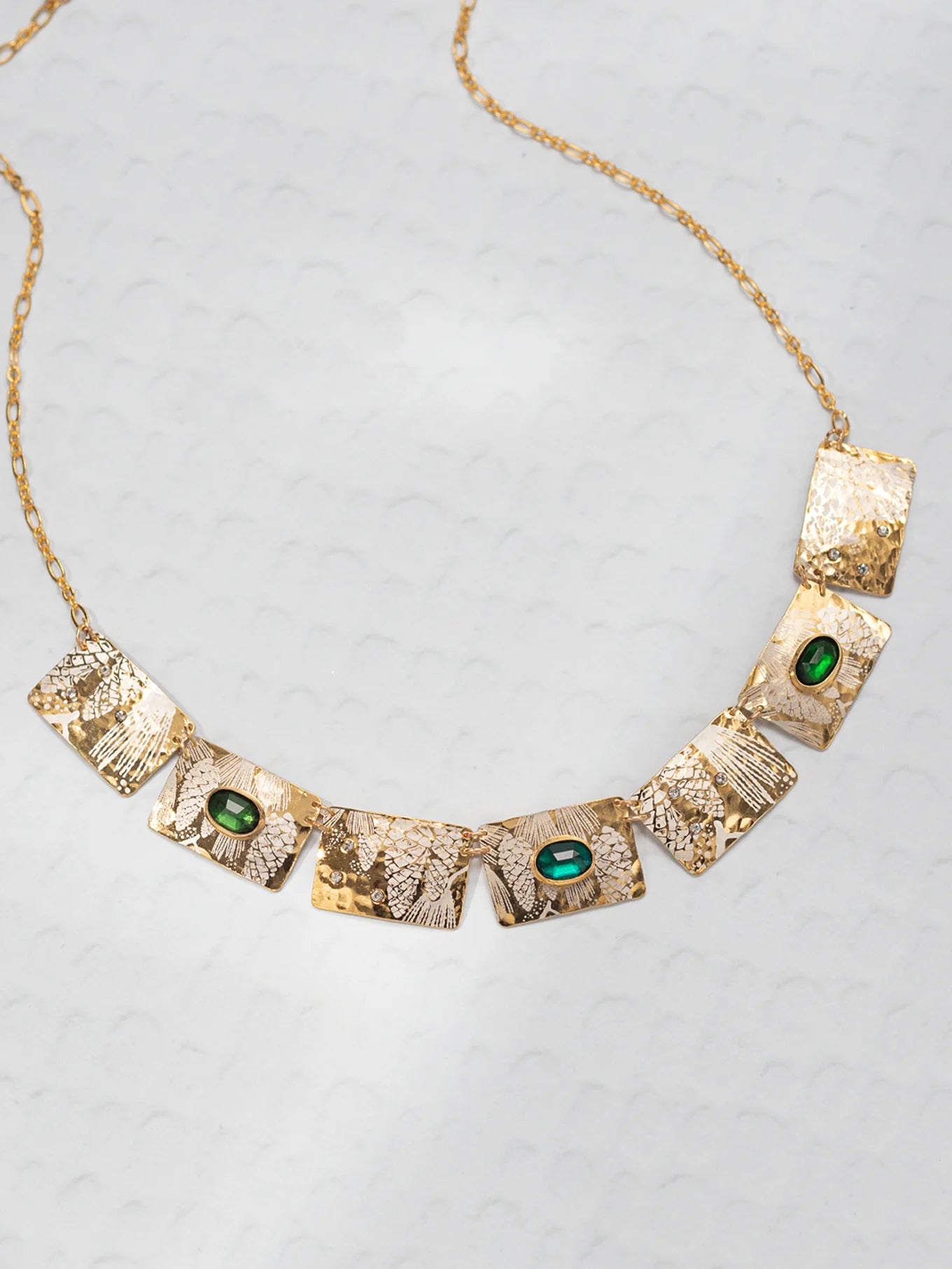 The Gilded Petra Necklace is the quintessential piece for parties and grand affairs, mingling lasered pinecone art and the colorful splash of emerald green crystals. Set on gilded links, its hints at Victorian charm with a splash of art deco inspirations thrown in for good measure.