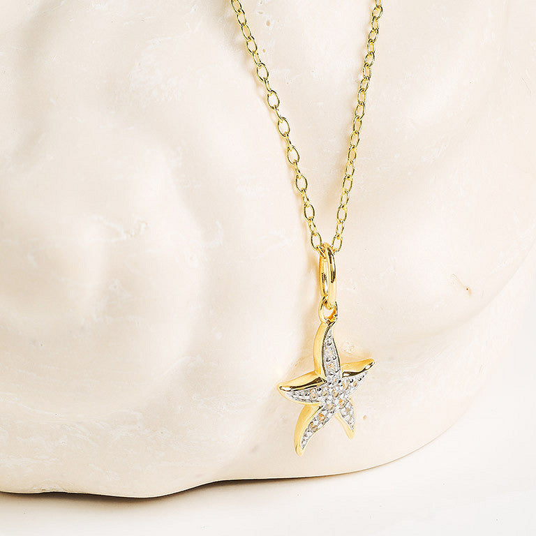 The Shanore Gold Vermeil & White Sapphire Starfish Mini Necklace features a shimmering starfish pendant, shown against a marble-inspired background.