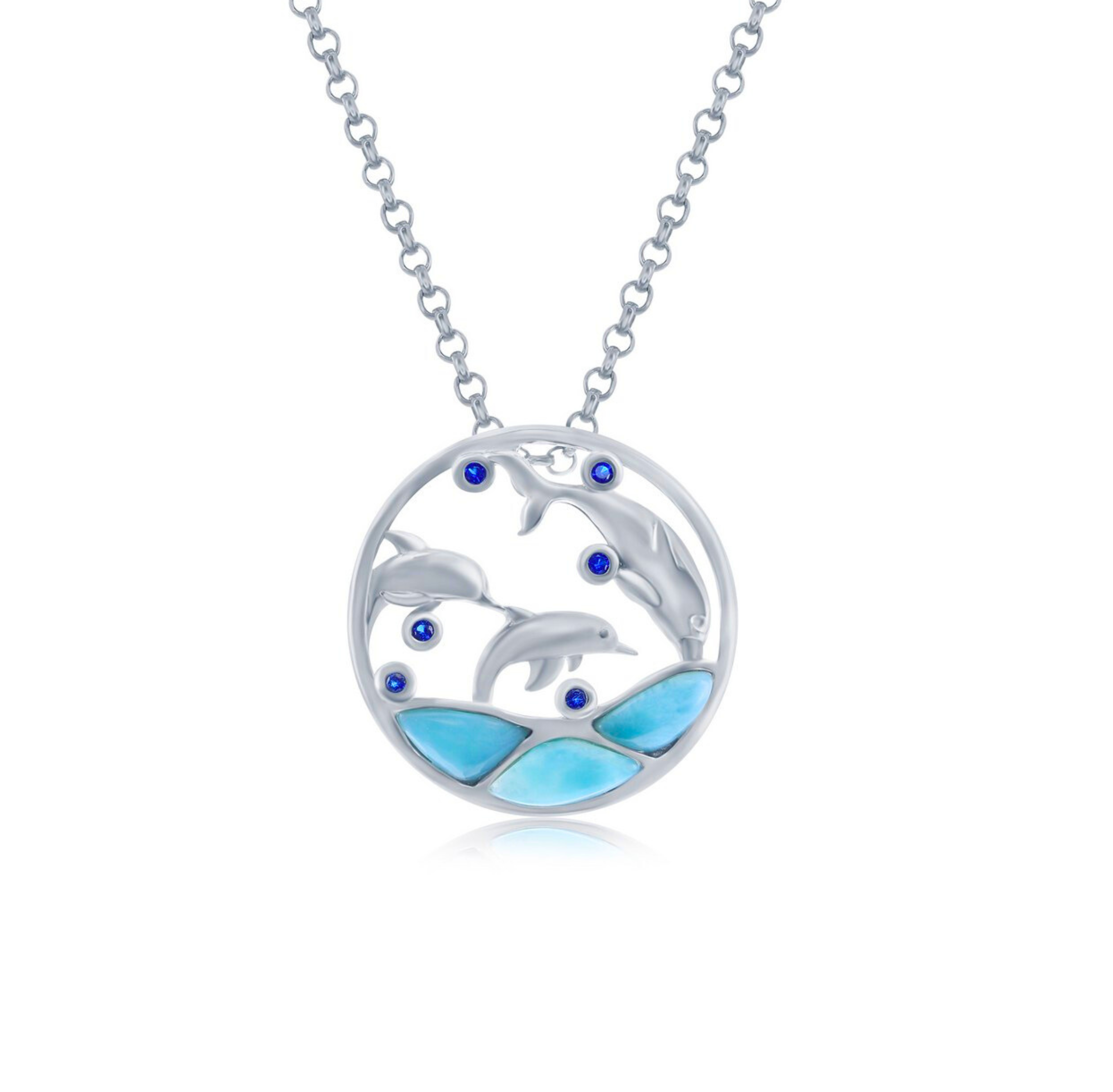 Larimar Three Diving Dolphins & CZ Necklace (w/Chain)